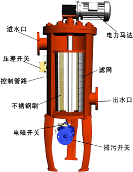 采用機(jī)電一體化設(shè)計(jì)。全自動(dòng)自清洗過(guò)濾器由驅(qū)動(dòng)機(jī)構(gòu)、控制管路(包括壓差開(kāi)關(guān))、主管組件、濾芯組件、清洗機(jī)構(gòu)、連接法蘭等主要零部件組成。 電控器、控制管路和排污閥構(gòu)成過(guò)濾器的控制部分,用于實(shí)現(xiàn)自動(dòng)清洗排污過(guò)程。 控制管路由壓差開(kāi)關(guān)、管接頭、黃銅管等附件組成。過(guò)濾器常規(guī)產(chǎn)品使用不銹鋼轉(zhuǎn)刷,也可根據(jù)不同的使用條件(水溫、水質(zhì)),選用其它材質(zhì)的轉(zhuǎn)刷。